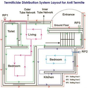 Termite Treatment through piping method/Termite tubing system also known as Pipe Reticulation system is a revolutionary system designed to effectively treat the area under concrete slabs or before flooring is done . It is system which is replenishable unlike older termite treatment methods. The reticulation system is a network of underground specially designed pipes( rubberised membrane) to induce anti-termite chemical uniformly throughout your Building’s foundations. Regulating the chemical flow, this system helps to protect against invasion by termites in future which would otherwise enter from the outside of your home or from under the floor. We recommend Termite reticulation system for Anti termite treatment because it is extremely durable and gives a very robust protection to a new building and works as a highly effective termite shield for years together. Our Anti termite Reticulation system is being widely used in Indian construction industry including new homes, offices and other commercial buildings.